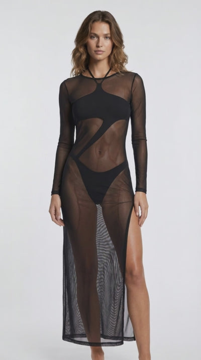 The Lina Dress features a sheer design with long sleeves and an open one-leg cover-up, making it an ideal choice for complementing any swimsuit. Its lightweight fabric enhances breathability, ensuring comfort in warm conditions, while the stylish look offers versatility for beach or poolside wear.